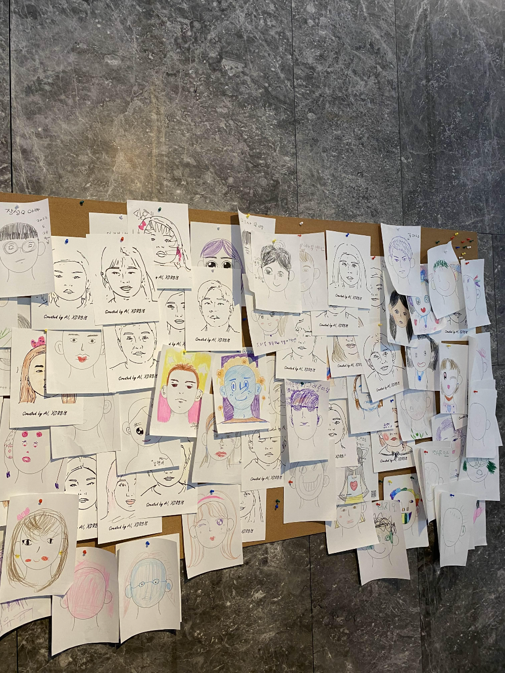 AI 그리고 사람들이 그린 초상화들 웨이팅 주변에는 AI가 그린 초상화가 붙어 있었고, 또 그냥 기본 얼굴형에 자유롭게 그림을 그릴 수 있는 공간이 마련되어 있었다. 왼쪽 사진에서 가운데 붙여진 그림 2점은 분명히 미대생이 그렸으리라. 👍👍