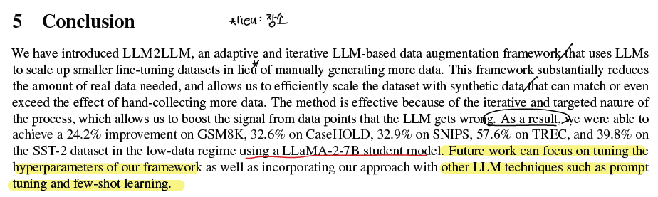 앞서 기술했던 실험 결과를 정리하면서 future work로 LLM2LLM framework에서의 hyperparameter 조정, 그리고 prompt tuning이나 few-shot learning과 같은 다른 LLM 테크닉과의 결합을 제안한다.