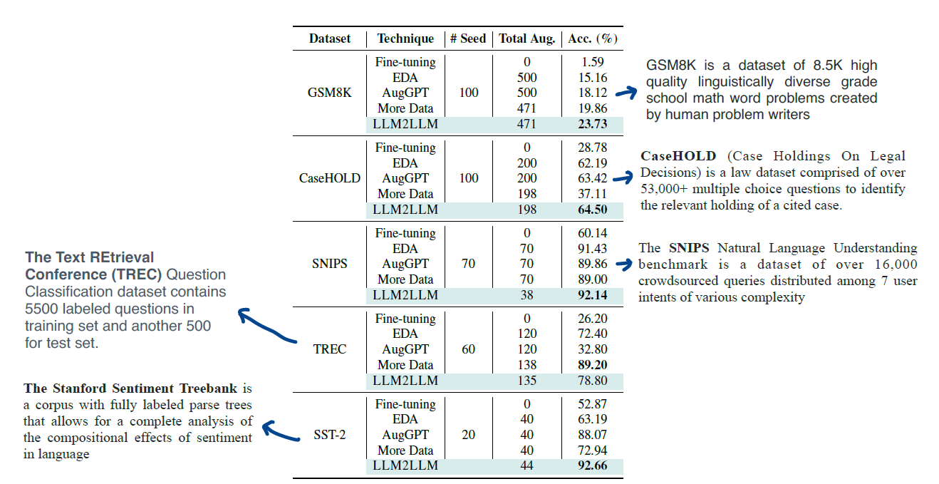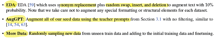 해당 방법은 EDA(Easy Data Augmentation)과 AugGPT와 비교분석하여 기술된다. 두 논문은 추가적으로 읽어보려 한다. 특히 AugGPT는 가능한 모든 data point에 대하여 prompted LLM을 사용했으나, 본 LLM2LLM은 Student LLM이 맞추지 못한 challenging examples에 대하여 augment를 사용했다는 점을 강조하고 있다.