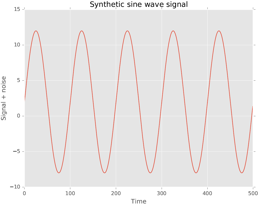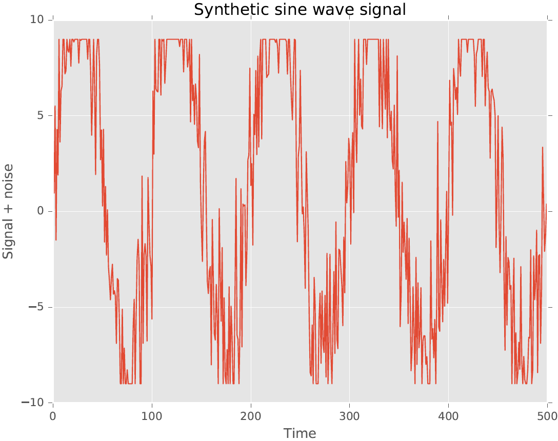 import numpy as np import matplotlib.pyplot as plt import matplotlib # properties SIG_AMPLITUDE = 10 SIG_OFFSET = 2 SIG_PERIOD = 100 NOISE_AMPLITUDE = 3 N_SAMPLES = 5 * SIG_PERIOD INSTRUMENT_RANGE = 9 # construct a sine wave times = np.arange(N_SAMPLES).astype(float) signal = SIG_AMPLITUDE * np.sin(2 * np.pi * times / SIG_PERIOD) + SIG_OFFSET # and mix it with some random noise noise = NOISE_AMPLITUDE * np.random.normal(size=N_SAMPLES) signal += noise # trucate spikes that are outside of the instrument range # (cut the noise) signal[signal > INSTRUMENT_RANGE] = INSTRUMENT_RANGE signal[signal < -INSTRUMENT_RANGE] = -INSTRUMENT_RANGE matplotlib.style.use("ggplot") # plot(x,y) plt.plot(times, signal) plt.title("Synthetic sine wave signal") plt.xlabel("Time") plt.ylabel("Signal + noise") plt.ylim(ymin = -SIG_AMPLITUDE, ymax = SIG_AMPLITUDE) # Save the plot plt.savefig("signal.pdf")numpy와 matplotlib 라이브러리를 이용한 (별도 라이브러리 설치 필요) 노이즈가 있는 synthetic sine wave.
