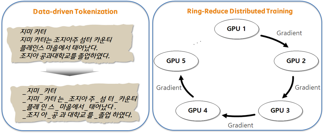 대량의 데이터를 빠른시간에 학습하기 위해 링 리듀스(ring-reduce) 기반 분산 학습 기술을 사용하여, 십억 개 이상의 문장을 다수의 머신에서 빠르게 학습하는 특징이 있다.