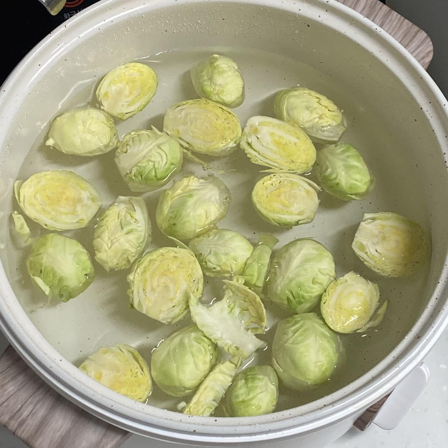 1. 날 것의 방울 양배추를 아래 사진과 같이 식초를 살짝 넣은 물에 10~15분 정도 담가준다. 나는 식초가 없어서 베이킹소다를 살짝 넣어주었다.