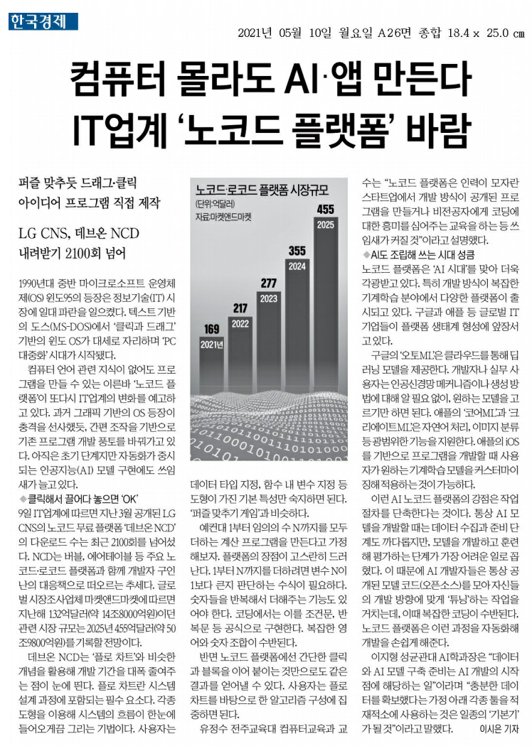 노코드 플랫폼 바람이 불고 있다. 프로그래밍뿐만 아니라 AI로도 넓혀가는 추세인 듯. 흥미로운 사실이며 한 번씩 써봐야겠다. 😏