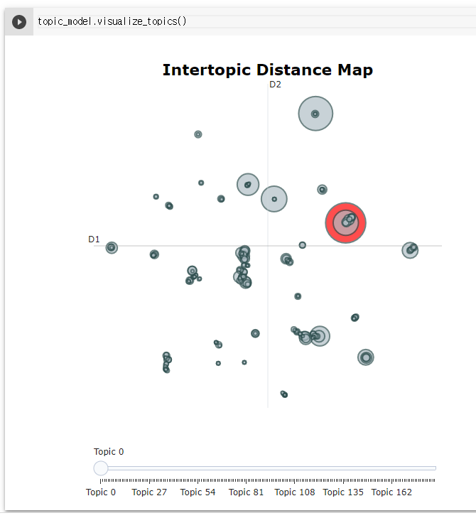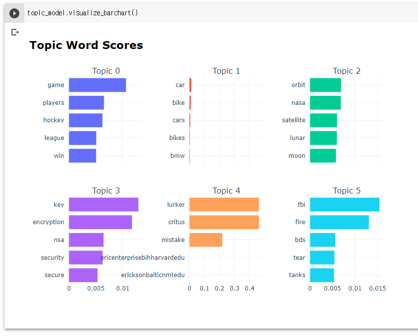 $ topic_model.get_topic_info() TopicCount Name 0 -1 6009 -1_your_file_jpeg_these 1 0 1805 0_game_players_hockey_league 2 1 1292 1_car_bike_cars_bikes 3 2 729 2_orbit_nasa_satellite_lunar 4 3 715 3_key_encryption_nsa_security ... ... ... ... 183 182 10 182_bbs_06066_2038752751_supermacs 184 183 10 183_catholic_steubenville_conference_attending 185 184 10 184_rama_krishna_prophethood_miracles 186 185 10 185_widget_converter_xt_widgets 187 186 10 186_crohns_inflammation_fatty_acids 188 rows × 3 columns $ topic_model.get_topic(0) [('game', 0.010642418887928884), ('players', 0.006542026629000378), ('hockey', 0.0062617223182814055), ('league', 0.005126299202655933), ('win', 0.005079979893241509), ('teams', 0.004776815398287238), ('player', 0.004554645075507119), ('nhl', 0.00423002246079115), ('goal', 0.0035617604615609142), ('hit', 0.0035613545685225494)]또한 소개에서 언급했듯 각종 visualization 함수로 graph를 볼 수도 있다.