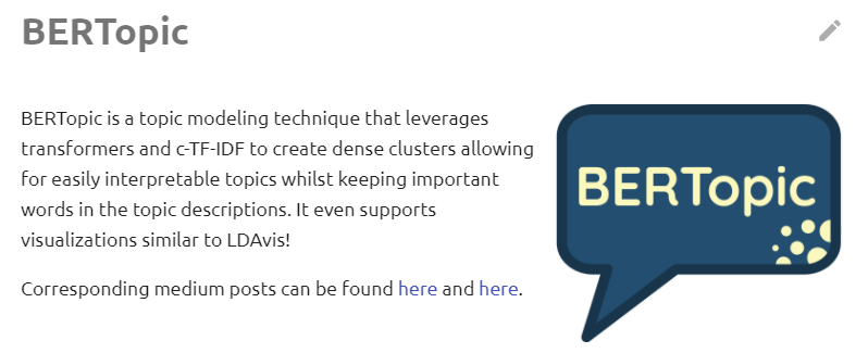 공식 홈페이지 설명에 의하면, BERTopic은 transformers와 c-TF-IDF를 활용한 토픽 모델링 기법으로, 쉽게 해석 가능한 주제(topic의 주요 keyword는 유지!)로 이루어진 dense한 cluster를 만들기 위해 사용된다고 한다. 모델과 함께 visualizations도 html로 제공하는데 이는 LDAvis와 유사하다고 한다!