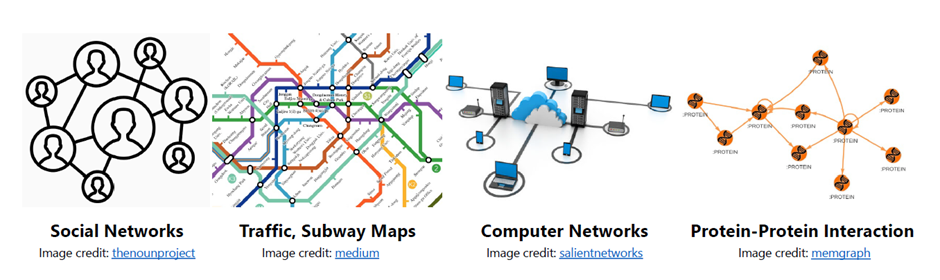 Graph는 entity와 relationship을 표현할 수 있는 자료구조로, 각 entity는 node (또는 vertex)로써 표현되며 relationship은 edge로써 표현됩니다. 즉 graph는 entity들의 관계나 상호 작용을 기술하고 분석할 수 있는 유일무이한 language라고도 할 수 있습니다. 아래 그림처럼 real-world의 data라고 할 수 있는 social networks, 지하철 노선도, 컴퓨터 네트워크, 단백질 구조 등이 graph로 표현할 수 있는 data의 대표적인 예 라고 할 수 있습니다.