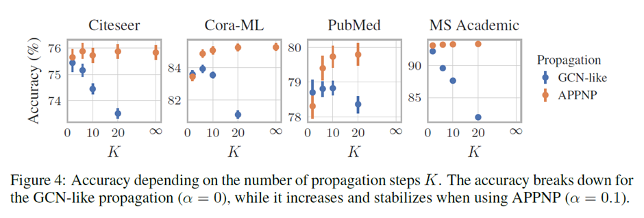 일반적인 GNN에서는 node에 대해 오직 몇 번의 propagation만 고려되고 neighbor coverage를 늘리기 쉽지 않다는 단점이 있었습니다. 본 논문에서는 큰 규모이고 adjustable한 node neighborhoods의 classification에 활용 가능하면서 어느 neural network에도 쉽게 결합 가능한 PPNP 모델과, 이에 대한 빠른 근사 버전인 APPNP 모델을 제시합니다.