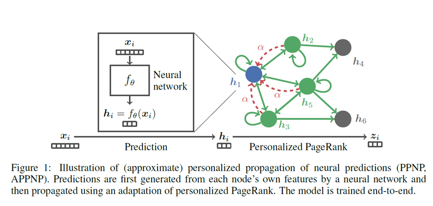본 논문에서는 GCN과 PageRank의 관계를 이용하여 Personalized PageRank (이하 PPR) 에 기반한 propagation scheme를 구축합니다. 그 결과로 PPNP (Personalized Propagation of Neural Predictions)라는 모델을 제시하며, 또한 최적화를 통해 APPNP (Approximate PPNP) 모델을 제시합니다.