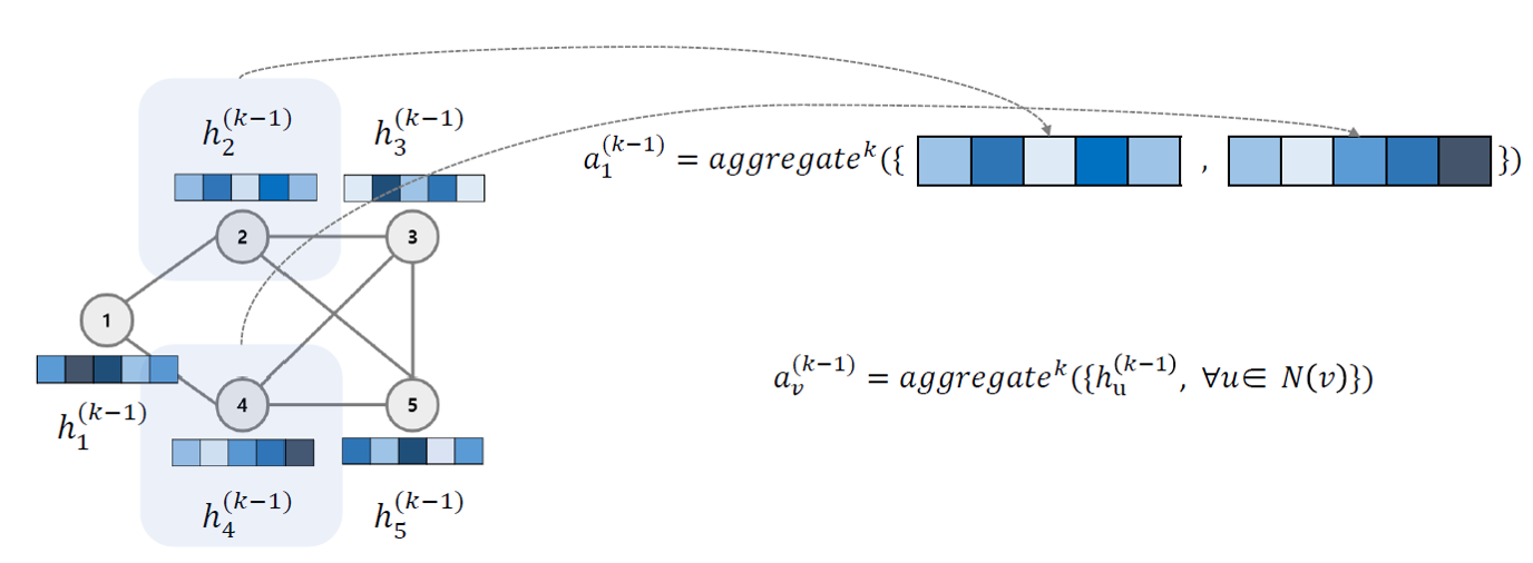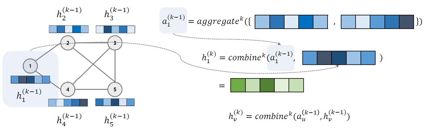 이웃 node들의 k-1번째의 hidden state를 결합합니다. 그림에서는 vertex 1은 2, 4와 연결되어 있으니 target node에 해당하는 aggregation 값은 k-1번째 h2, h4를 결합한 값이 되겠습니다.