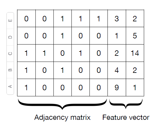 Graph를 표현하는 방법 중 가장 naive하게 접근하는 방법입니다. 위 그래프와 같은 undirected graph가 있다고 하면, 인접 행렬(adjacency matrix)과 각 node의 feature를 추출한 feature vector는 아래와 같이 나오게 됩니다. Feature value의 경우 임의의 값을 정하여 넣었습니다.