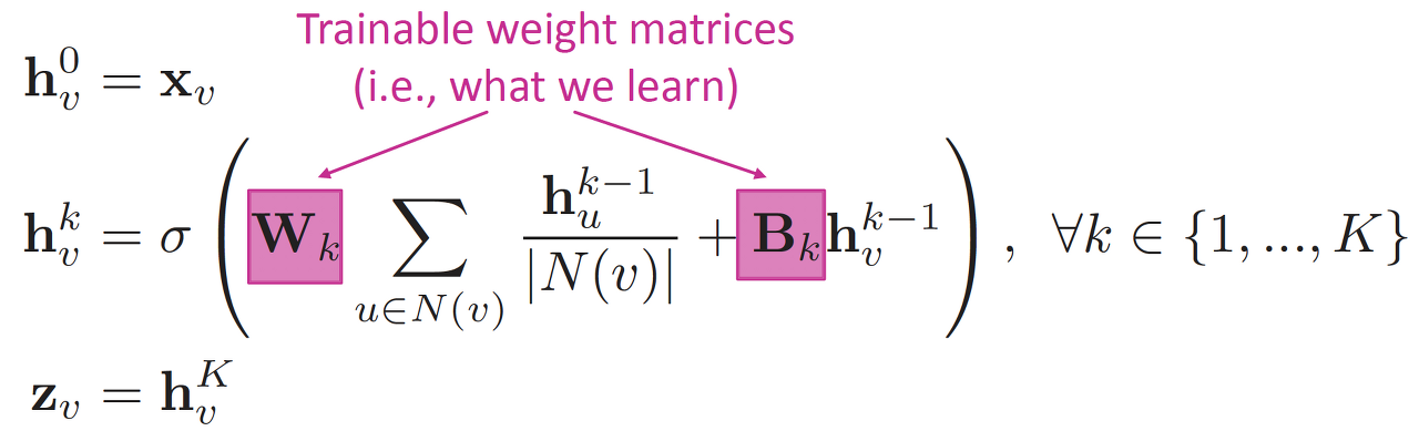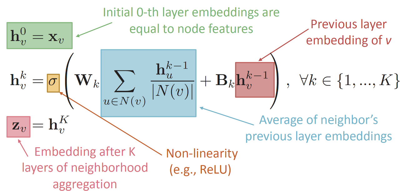 두 번째 식을 풀어서 설명하자면 다음과 같습니다 (K/k 대소문자 유의하면서, 색을 맞춰보며 이해해 보아요!) — 1부터 K 사이에 존재하는 모든 k에 대하여, k번째 hidden state는 해당 노드에 인접한 neighbor들의 직전 layer (k-1번째 layer) embedding 의 평균과 가중치 W의 곱에, 직전 layer embedding 값에 B를 곱한 결과에다가 비선형성을 준 최종 값이 k번째 node의 hidden state를 embedding한 값이 되겠습니다. 그리하여 마지막 K번째 layer에서 aggregation 값을 얻을 수 있게 되고, 그것을 z_v라고 칭하게 된 것이죠. 문장이 길어서 한번에 읽기 힘들었을 수도 있는데 이제 숨 쉬어도 됩니다~! ㅎㅎ