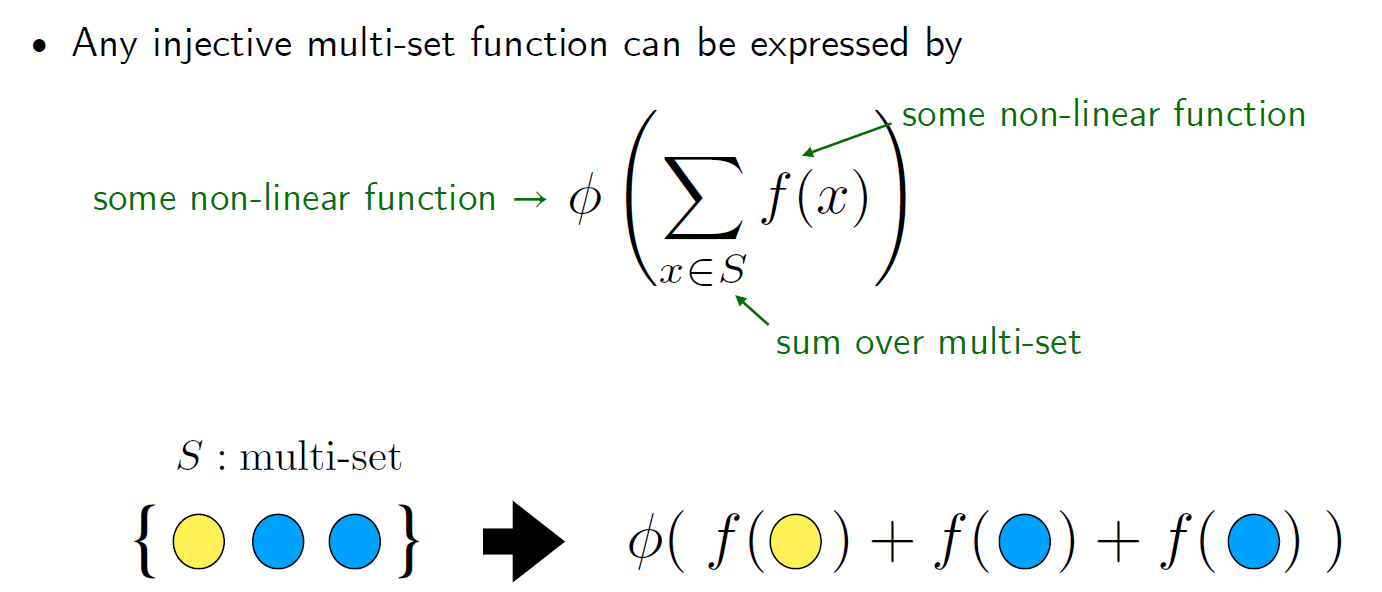 그 식은 생각보다 간단합니다. 비선형 함수를 먼저 적용하고, 이를 더한 다음 다시 비선형성을 주는 거죠. MLP + Sum Pooling의 형태로 이해하면 되겠습니다.