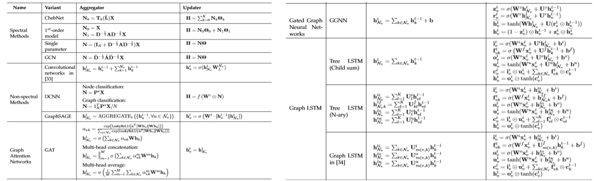 위에서 소개한 GCN, GIN 모델에서 봤듯이 aggregation, combination에 따라서 network의 특성이 확연히 달라지면서 특정 task에 특화되는 양상을 보입니다. 아래 테이블은 다양한 GNN 모델들의 aggregator, updater를 명기해 놓은 자료입니다. Hoxy.. 나도 식 하나 만들면 논문 뚝딱...? 🙄🙄ㅎㅎ
