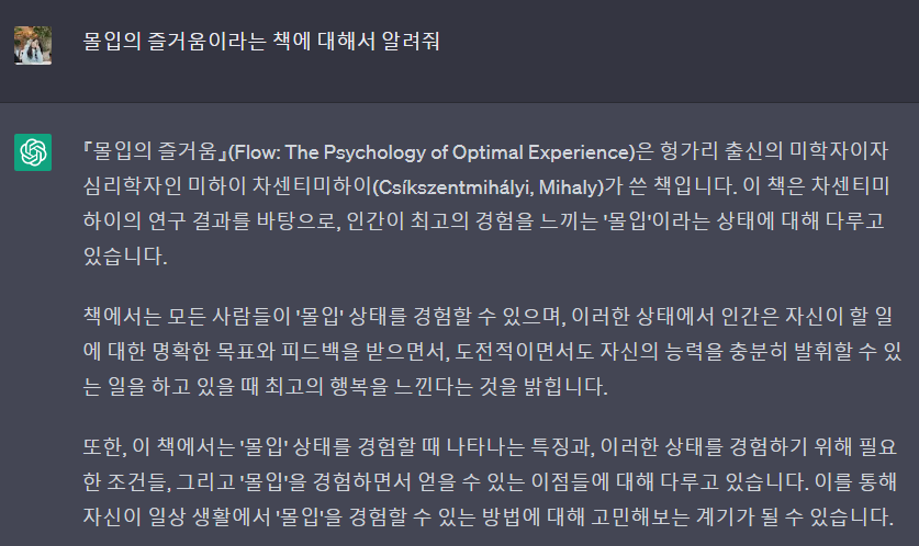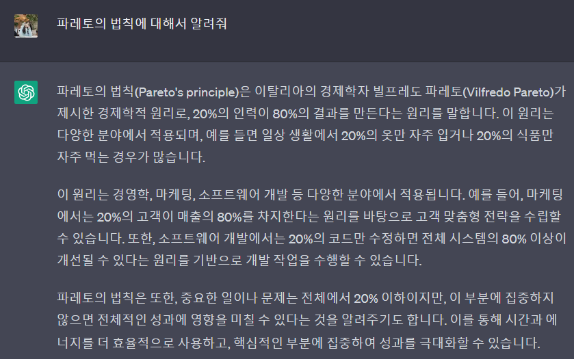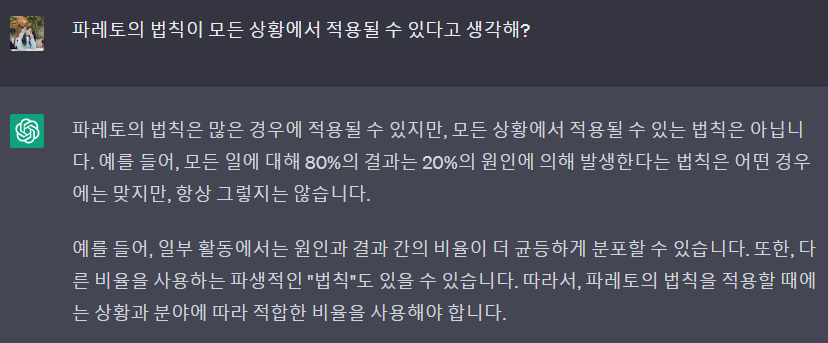 혹시나 파레토의 법칙이 만물의 법칙처럼 만능으로 쓰일까? 궁금해서 물어봤더니 ChatGPT는 우문현답을 해주었다. 덧붙여서, 역자님(?) 께서 3권의 책을 추천해주셨다. 위에서 언급된 '몰입의 즐거움(Flow: The Psychology of Optimal Experience)', 'EBS 자본주의', 그리고 마지막으로는... 기억이 나지 않는다고 하셨다. ㅋㅋㅋ 혹시라도 이 글을 보시게 되신다면 알려주시면 감사하겠습니다 !!